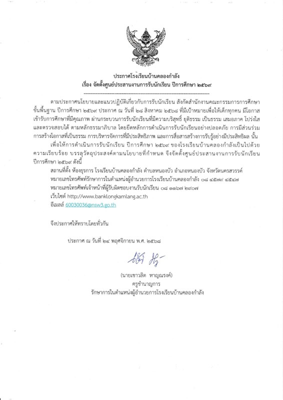 ประกาศโรงเรียนบ้านคลองกำลัง เรื่อง จัดตั้งศูนย์ประสานงานการรับนักเรียน ปีการศึกษา 2569