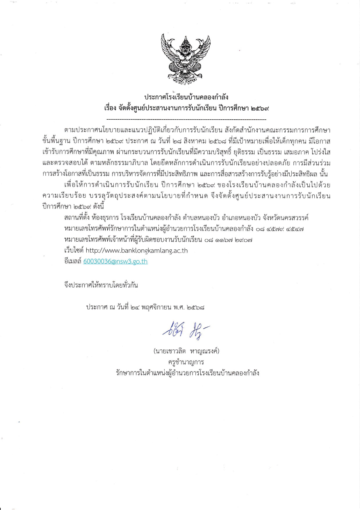 ประกาศโรงเรียนบ้านคลองกำลัง เรื่อง จัดตั้งศูนย์ประสานงานการรับนักเรียน ปีการศึกษา 2569